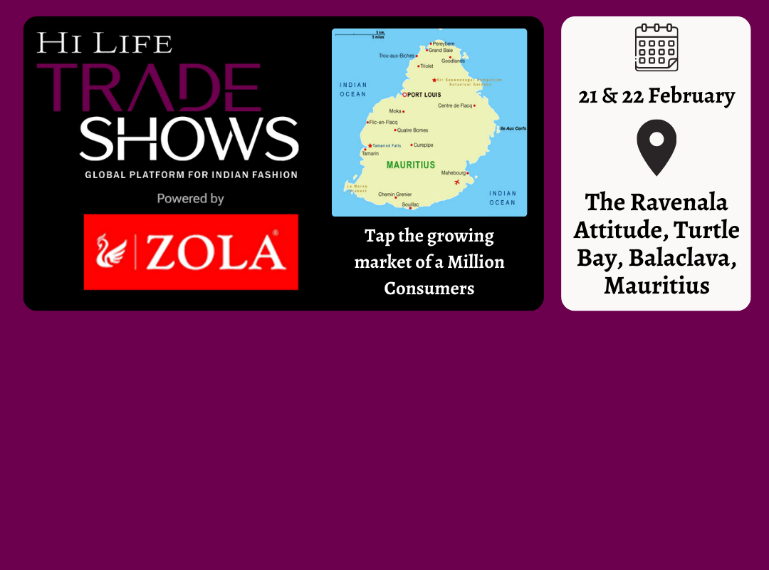 1 Feb Chance for Garment Manufacturers to expand into the Mauritius Market Casual Wear Ethnic Wear Events Fashion Garments Mauritius Mauritius is a great prospect for Indian Garment Manufacturers to sell their garments to 800+ retail stores where 70% people are of Indian Origin. Hi-Life Trade Shows is a great platform to expand your business & network in the Mauritius market and show case your products. The exhibition is held on 21 & 22 February […]